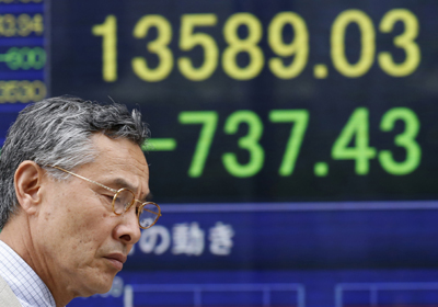 圖為當(dāng)日,一名男子走過日本東京一家證券公司的股票價(jià)格顯示屏。