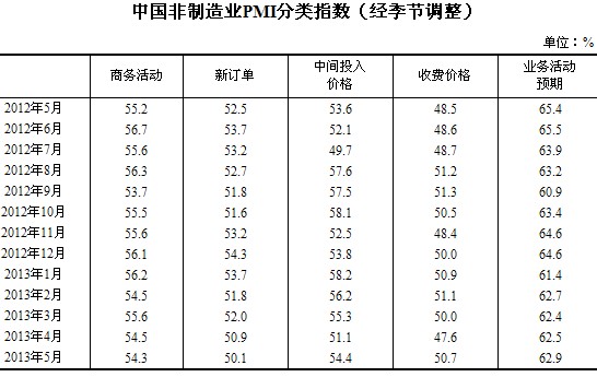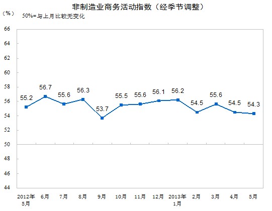 2013年5月,中國非制造業(yè)商務(wù)活動指數(shù)為54.3%,比上月回落0.2個(gè)百分點(diǎn)。