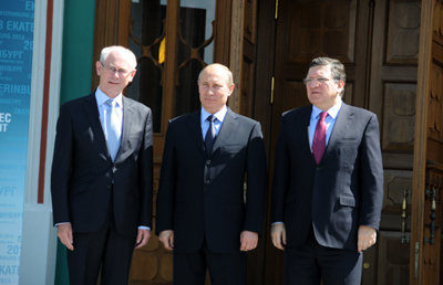 6月4日,在俄羅斯葉卡捷琳堡,俄羅斯總統(tǒng)普京(中)、歐盟委員會主席巴羅佐(右)和歐洲理事會主席范龍佩(左)出席第31屆俄羅斯-歐盟峰會。