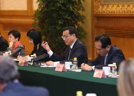 6月5日,國務院總理李克強在人民大會堂同出席2013財富全球論壇和出席全球首席執(zhí)行官委員會的企業(yè)家代表會見并座談。 李克強說,在世界市場持續(xù)低迷、經(jīng)濟復蘇艱難曲折的背景下,中國工業(yè)化、城鎮(zhèn)化進程將帶來巨大需求。他勉勵在座企業(yè)家抓住中國發(fā)展帶來的巨大機遇,拓展合作共贏的新途徑。