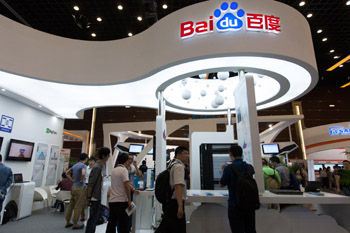 “第五屆中國(guó)云計(jì)算大會(huì)”日前在北京舉行。在云計(jì)算服務(wù)展示區(qū)域,參觀者在百度展臺(tái)參觀。記者