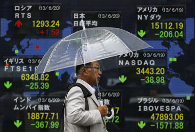 圖為20日一名日本男子舉傘走過電子交易顯示屏。
