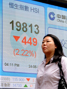 美聯(lián)儲表態(tài)逐步退出量化寬松,中國驟然出現(xiàn)“錢荒”,日本央行稱不會用“彈藥”救市,多重因素導(dǎo)致亞太主要股市周一大跌,日本日經(jīng)指數(shù)、香港恒生指數(shù)、韓國綜合指數(shù)、新加坡海峽時報指數(shù)、澳大利亞S&P/ASX200指數(shù)分別下跌1.26%、2.22%、1.31%、1.2%、1.6%。 圖為一行人24日從香港中環(huán)一家銀行的恒生指數(shù)電子顯示屏前走過。