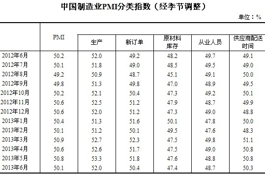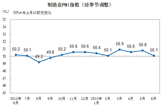 2013年6月,中國制造業(yè)采購經(jīng)理指數(shù)(PMI)為50.1%,比上月回落0.7個百分點(diǎn)。