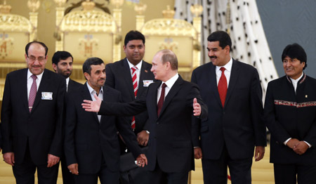 當(dāng)?shù)貢r間7月1日,為期兩天的天然氣出口國論壇在莫斯科舉行。俄羅斯總統(tǒng)普京(右三)在克里姆林宮與出席論壇的伊朗、委內(nèi)瑞拉等國領(lǐng)導(dǎo)人集體合影。普京在論壇首日呼吁天然氣出口國之間加強合作,形成單一定價機制。近年來,頁巖氣在北美等地逐漸擴大開發(fā)利用規(guī)模,重塑世界能源市場格局,傳統(tǒng)的天然氣出口國遭遇嚴峻挑戰(zhàn)。