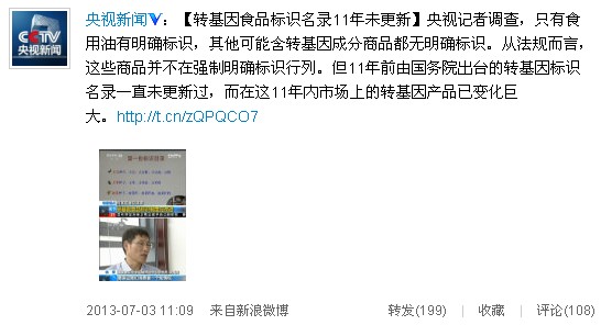 央視記者調查,只有食用油有明確標識,其他可能含轉基因成分商品都無明確標識。從法規(guī)而言,這些商品并不在強制明確標識行列。但11年前由國務院出臺的轉基因標識名錄一直未更新過,而在這11年內市場上的轉基因產品已變化巨大。