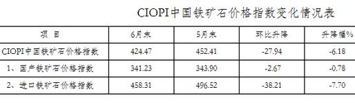 6月末,中國鐵礦石價格指數(shù)(CIOPI)為424.47點,環(huán)比下降27.94點,降幅為6.18%,較上月加大了1.07個百分點。其中:國產(chǎn)鐵礦石價格指數(shù)為341.23點,環(huán)比下降0.78%;進口鐵礦石價格指數(shù)為458.31點,環(huán)比下降7.70%,進口鐵礦石價格指數(shù)降幅大于國產(chǎn)鐵礦石。(見下表)