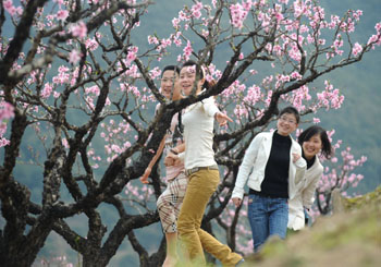 田壟上勞作的老漢跟好奇的游客攀談桃事,“夏天來我家吃桃子吧,正宗的水蜜桃,樹上養(yǎng)熟的!狈罨硕贾浪f的那種桃子:不同于為了方便運(yùn)輸在它變軟之前提早采摘下來的,而是供桃樹的主人享用而任它在樹上長到自然的果熟蒂落的。那種桃子拿在手里是軟乎乎的,看著是半透明的,里邊的果肉都化成了一包蜜水,可以找一根麥秸,戳破表皮深入到果肉中像喝飲料一樣吸……這么想著,讓人真恨不得把時(shí)間馬上拔到七八月水蜜桃成熟的季節(jié),或者直接找根吸管對(duì)著桃花去吮吸花萼深處的花蜜。