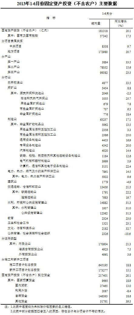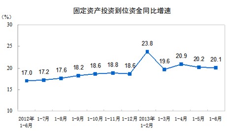 2013年1-6月份,全國固定資產(chǎn)投資(不含農(nóng)戶)181318億元,同比名義增長20.1%(扣除價格因素實際增長20.1%),增速比1-5月份回落0.3個百分點。從環(huán)比看,6月份固定資產(chǎn)投資(不含農(nóng)戶)增長1.51%。