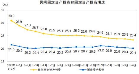 2013年1-6月份,全國民間固定資產(chǎn)投資115584億元,同比名義增長23.4%(扣除價格因素實際增長23.4%),增速比1-5月份回落0.4個百分點。民間固定資產(chǎn)投資占固定資產(chǎn)投資的比重為63.7%。