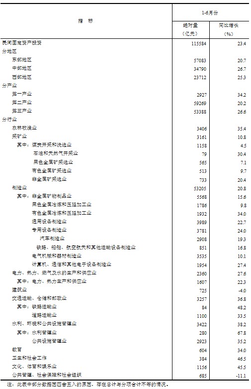 分地區(qū)看,東部地區(qū)民間固定資產(chǎn)投資57083億元,同比增長20.7%,增速比1-5月份提高0.3個百分點;中部地區(qū)34790億元,增長26.7%,增速回落1.5個百分點;西部地區(qū)23712億元,增長25.3%,增速回落1.1個百分點。