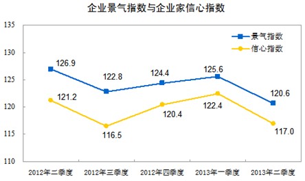 2013年二季度企業(yè)景氣指數(shù)為120.6,比一季度低5.0點(diǎn),但仍明顯高于100的景氣臨界值,企業(yè)運(yùn)行仍處在景氣區(qū)間。其中,反映企業(yè)當(dāng)前景氣狀態(tài)的即期企業(yè)景氣指數(shù)為117.0,比一季度低2.0點(diǎn);反映企業(yè)未來(lái)景氣預(yù)判的預(yù)期企業(yè)景氣指數(shù)為123.0,比一季度低6.9點(diǎn)。二季度,企業(yè)家信心指數(shù)為117.0,比一季度低5.4點(diǎn)。