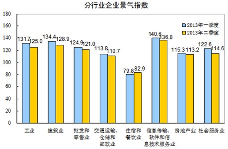 分行業(yè)看,按企業(yè)景氣指數(shù)高低排序依次是信息傳輸軟件和信息技術(shù)服務(wù)業(yè)、建筑業(yè)、工業(yè)、批發(fā)和零售業(yè)、社會(huì)服務(wù)業(yè)、房地產(chǎn)業(yè)、交通運(yùn)輸倉(cāng)儲(chǔ)和郵政業(yè)、住宿和餐飲業(yè),二季度企業(yè)景氣指數(shù)依次為136.8、128.9、125.0、121.0、114.6、113.2、110.7、82.9,除住宿和餐飲業(yè)外,其他行業(yè)均處在景氣臨界值以上。與一季度結(jié)果相比,信息傳輸軟件和信息技術(shù)服務(wù)業(yè)、建筑業(yè)、工業(yè)、批發(fā)和零售業(yè)、社會(huì)服務(wù)業(yè)、房地產(chǎn)業(yè)、交通運(yùn)輸倉(cāng)儲(chǔ)和郵政業(yè)分別下降3.8、5.5、6.7、3.9、8.0、2.1、3.1點(diǎn);住宿和餐飲業(yè)上升3.1點(diǎn)。