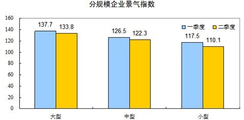 分企業(yè)規(guī)?,大、中、小型企業(yè)景氣指數(shù)分別為133.8、122.3、110.1,均處在景氣臨界值以上,但分別比一季度回落3.9、4.2和7.4點(diǎn)。