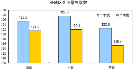 分地區(qū)看,東、中、西部地區(qū)的企業(yè)景氣指數(shù)分別為121.5、122.1、115.4,均處在景氣臨界值以上,但比一季度分別回落4、5.5和7.2個(gè)百分點(diǎn)。
