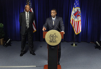 7月18日,美國底特律緊急財政管理人凱文·奧爾(右)在底特律出席新聞發(fā)布會。奧爾當(dāng)天獲密歇根州州長里克·斯奈德授權(quán),向位于底特律的美國破產(chǎn)法院遞交破產(chǎn)申請! ⌒氯A社/美聯(lián) |