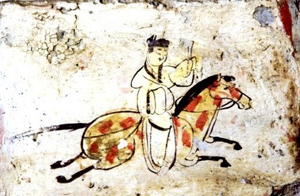 一是《驛使圖》——全國郵政的標志,出自5號墓。畫面是一個驛使騎在紅鬃馬上,頭戴進賢冠,身穿寬袖衣,足蹬長靴,左手舉木牘文書,右手持馬韁,驛騎四蹄騰空,信使則穩(wěn)坐馬背飛奔傳遞。這幅驛使圖再現(xiàn)了當時西北邊疆驛使馳送文書的情景,被認為是我國發(fā)現(xiàn)最早的古代郵驛的形象資料。