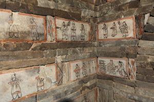 嘉峪關(guān)長城研究所張曉東說,墓室以干磚壘砌而成,墓室四壁為表現(xiàn)勞動人民各種生產(chǎn)生活、奴婢仆從的雜役和墓主人享樂生活的磚畫,如宴樂、狩獵、馴鹿、采桑、驛傳、舞蹈、農(nóng)耕、博弈、釀酒、屠宰、出巡等。