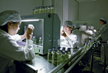 圖為新昌制藥廠工人在做制劑燈檢。資料照片 |
