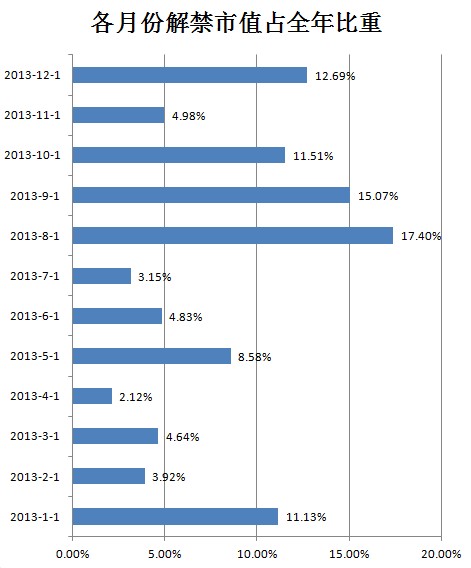 數(shù)據(jù)顯示,創(chuàng)業(yè)板今年解禁市值總額為2646.26億元,8月份解禁460.47億元位居年內第一,9月份解禁398.66億元排名第二,12月份解禁335.88億元排名第三,他們占全年的比重分別為17.40%、15.07%和12.69%。