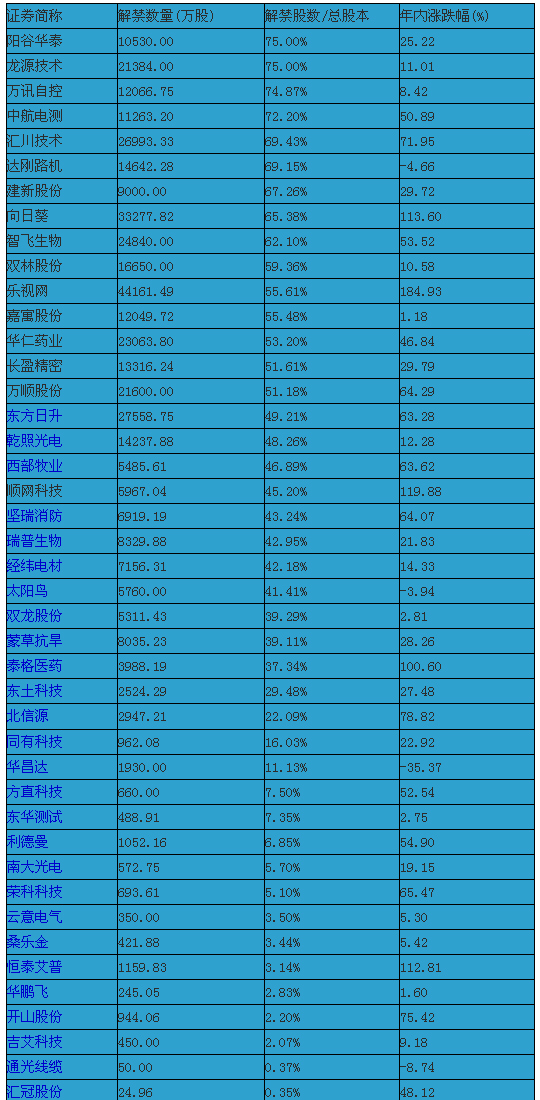 數(shù)據(jù)還顯示,在解禁比重超過50%的個股中,向日葵、樂視網(wǎng)年內漲幅分別高達113.60%和184.93%;此外,解禁比重達45.20%的順網(wǎng)科技年內漲幅也高達119.88%。