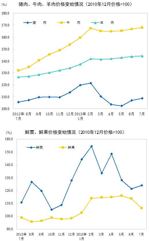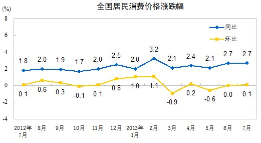 2013年7月份,全國(guó)居民消費(fèi)價(jià)格總水平同比上漲2.7%。其中,城市上漲2.6%,農(nóng)村上漲2.9%;食品價(jià)格上漲5.0%,非食品價(jià)格上漲1.6%;消費(fèi)品價(jià)格上漲2.7%,服務(wù)價(jià)格上漲2.7%。1-7月平均,全國(guó)居民消費(fèi)價(jià)格總水平比去年同期上漲2.4%。