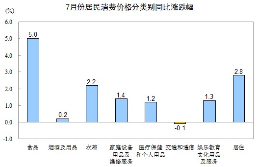 7月份,非食品價(jià)格環(huán)比上漲0.2%。其中,家庭設(shè)備用品及維修服務(wù)、交通和通信、娛樂(lè)教育文化用品及服務(wù)、居住價(jià)格分別上漲0.1%、0.3%、0.8%和0.3%,衣著價(jià)格下降0.6%,煙酒及用品、醫(yī)療保健和個(gè)人用品價(jià)格均持平。娛樂(lè)教育文化用品及服務(wù)中,旅游價(jià)格上漲4.9%。