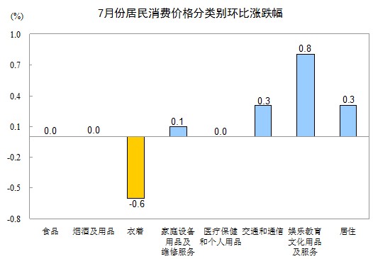 7月份,全國(guó)居民消費(fèi)價(jià)格總水平環(huán)比上漲0.1%。其中,城市上漲0.1%,農(nóng)村持平(漲跌幅度為0,下同);食品價(jià)格持平,非食品價(jià)格上漲0.2%;消費(fèi)品價(jià)格下降0.1%,服務(wù)價(jià)格上漲0.6%。