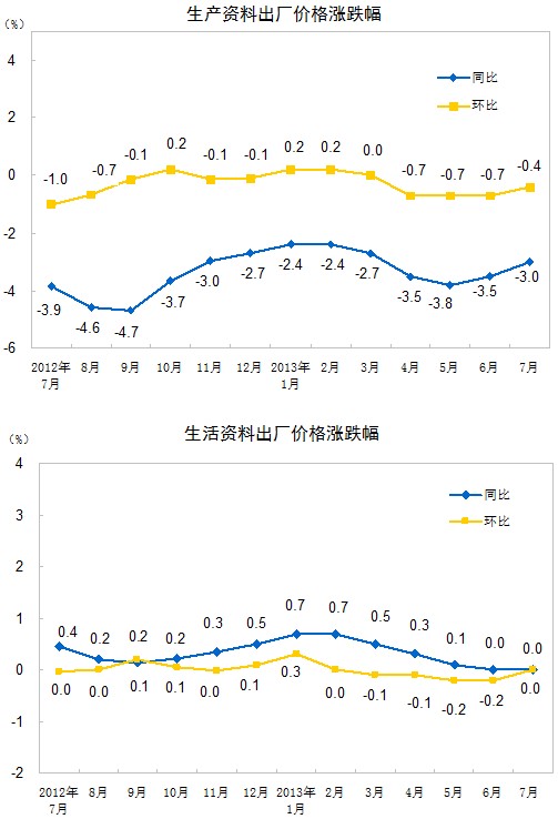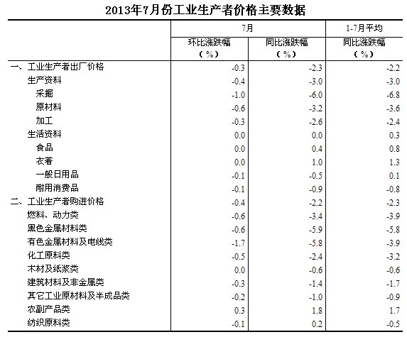 2013年7月份,全國(guó)工業(yè)生產(chǎn)者出廠價(jià)格同比下降2.3%,環(huán)比下降0.3%。工業(yè)生產(chǎn)者購(gòu)進(jìn)價(jià)格同比下降2.2%,環(huán)比下降0.4%。1-7月平均,工業(yè)生產(chǎn)者出廠價(jià)格同比下降2.2%,工業(yè)生產(chǎn)者購(gòu)進(jìn)價(jià)格同比下降2.3%。