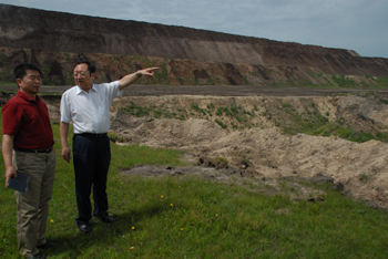 神寶能源董事長劉明(右)向北京環(huán)境交易所董事長杜少中介紹說,今年以來,神寶能源和內(nèi)蒙古自治區(qū)、呼倫貝爾市、陳巴爾虎旗三級政府共同籌資4000多萬元,冒頂坑治理殲滅戰(zhàn)全面打響。記者