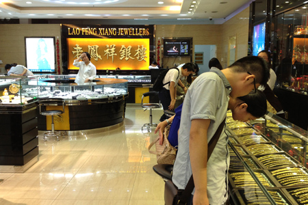 8月12日,國(guó)家發(fā)展和改革委員會(huì)宣布,上海黃金飾品行業(yè)協(xié)會(huì)因組織部分金店壟斷黃金、鉑金飾品價(jià)格,被處以最高50萬元罰款;5家金店因壟斷價(jià)格被處以上一年度相關(guān)銷售額1%的罰款,共計(jì)人民幣1009.37萬元。 圖為當(dāng)日在上海某商場(chǎng)里的“老鳳祥銀樓”店鋪,顧客在選購黃金產(chǎn)品。