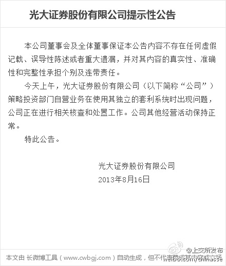不過14:22上交所官方微博轉(zhuǎn)發(fā)的光大證券股份有限公司提示性公告中稱:“今天上午,光大證券股份有限公司策略投資部門自營業(yè)務在使用其獨立的套利系統(tǒng)時出現(xiàn)問題,公司正在進行相關核查和處置工作!睋(jù)媒體報道,上海交易所已聯(lián)系上光大,暴漲是光大系統(tǒng)問題,他們技術人員在查,但還沒查出原因。