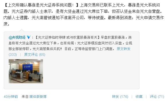 據(jù)央視財經(jīng)微博最新報道,光大已申請交易作廢。