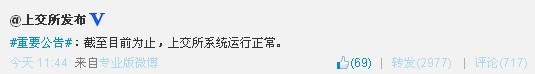 上交所官方微博上午(11:44)表示,截至目前為止,上交所系統(tǒng)運行正常。