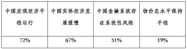 調(diào)查結(jié)果顯示,72%的專家認(rèn)為當(dāng)前中國宏觀經(jīng)濟平穩(wěn)運行,增長速度處于合理區(qū)間;67%的專家認(rèn)為中國實體經(jīng)濟發(fā)展緩慢;51%的專家認(rèn)為中國金融系統(tǒng)存在系統(tǒng)性風(fēng)險;19%的專家認(rèn)為物價總水平保持平穩(wěn),漲價趨勢減弱,居民消費預(yù)期增強;只有2%的專家認(rèn)為居民收入水平有望提高。