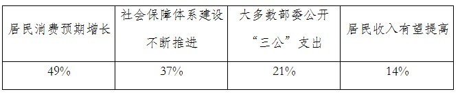 調(diào)查顯示,49%的專家將“物價總水平保持穩(wěn)定,居民消費預(yù)期增長”視為當(dāng)前中國宏觀經(jīng)濟的突出亮點;37%的專家認(rèn)為是“社會保障體系建設(shè)不斷推進,醫(yī)療保險覆蓋面快速擴大”;21%的專家認(rèn)為是“各地出臺政策法規(guī),大多數(shù)部委公開‘三公’支出”;14%的專家認(rèn)為是“國務(wù)院批轉(zhuǎn)《關(guān)于深化收入分配制度改革的若干意見》,居民收入有望提高”;