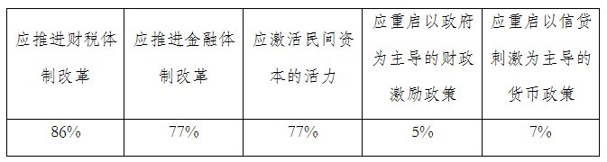 調(diào)查結(jié)果表明,86%的專家認(rèn)為應(yīng)推進財稅體制改革,出臺對小微企業(yè)的減稅措施,全面推進增值稅轉(zhuǎn)型,釋放財稅體制改革紅利;77%的專家認(rèn)為應(yīng)推進金融體制改革,讓實體經(jīng)濟復(fù)活起來,釋放金融改革紅利;77%的專家認(rèn)為應(yīng)激活民間資本的活力,“市場能辦的多給市場”。此外,有兩位專家給出了不同的意見:一位專家認(rèn)為中國政府應(yīng)保持目前政策的連續(xù)性和穩(wěn)定性;另外一位專家則認(rèn)為中國政府應(yīng)適時適度進行預(yù)調(diào)和微調(diào),綜合運用各種政策工具。另外,5%的專家認(rèn)為中國政府應(yīng)重啟以政府為主導(dǎo)的大規(guī)模的財政激勵政策,7%的專家認(rèn)為中國政府應(yīng)重啟以信貸刺激為主導(dǎo)的貨幣政策。從調(diào)查結(jié)果來看,多數(shù)專家認(rèn)為中國政府不可能重啟以政府投資為主導(dǎo)的大規(guī)模財政激勵政策和以信貸刺激為主導(dǎo)的貨幣政策,而是將適時適度進行微調(diào),加快推進財稅體制、金融體制和激活民間資本的活力等方面的改革,進一步釋放制度改革紅利。