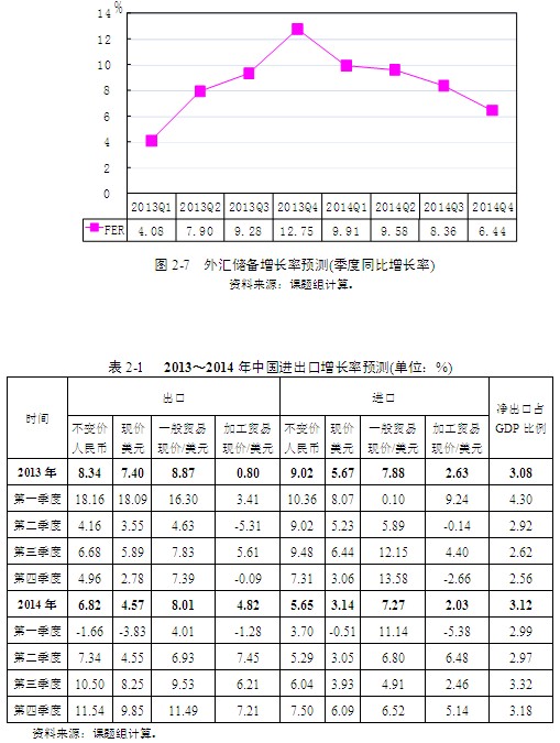 2013年外部市場(chǎng)需求萎縮導(dǎo)致中國(guó)進(jìn)出口減速的態(tài)勢(shì)還將繼續(xù)。模型預(yù)測(cè)顯示,2013年以美元、按現(xiàn)價(jià)計(jì)算的出口總額將增長(zhǎng)7.40%,比上年下降0.54個(gè)百分點(diǎn);進(jìn)口總額增速可能上升至5.67%,比上年提高1.31個(gè)百分點(diǎn)(表2-1)。分季度看,出口增速在2013年第三季度可能上升至5.89%,隨后在第四季度將下降到2.78%;進(jìn)口增速在2013年第三季度可能回升至6.44%,第四季度將下降到3.06%的全年最低增速。進(jìn)一步,2013年加工貿(mào)易出口增速可能僅為0.8%,一般貿(mào)易出口增速則可維持在8.87%。2013年外匯儲(chǔ)備預(yù)計(jì)可以增長(zhǎng)8.52%,比上年提高4.43個(gè)百分點(diǎn)(圖2-7)。至2014年,以美元、按現(xiàn)價(jià)計(jì)算的出口增速預(yù)計(jì)將達(dá)到4.57%;進(jìn)口增速預(yù)計(jì)將達(dá)到3.14%;加工貿(mào)易出口增速可能提高至4.82%,一般貿(mào)易出口增速保持在8.01%。2014年外匯儲(chǔ)備將可能增長(zhǎng)8.53%(表2-1)。此外,2013年凈出口占GDP的比重預(yù)計(jì)為3.08%,2014年約為3.12%。