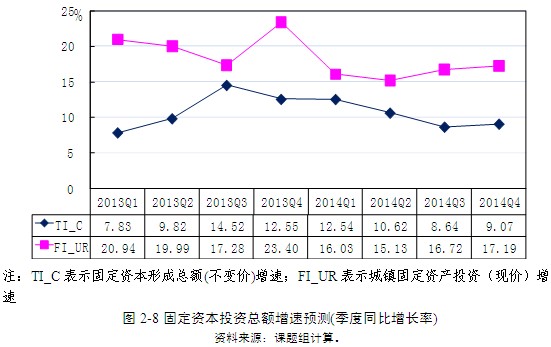 2013年下半年,為“保增長(zhǎng)”以及推進(jìn)城鎮(zhèn)化建設(shè)的需要,基礎(chǔ)設(shè)施的投資增速預(yù)計(jì)將有所提高。模型預(yù)測(cè)(圖2-8),2013年按不變價(jià)計(jì)算的固定資本形成總額增速為11.20%,比上年提高2.97個(gè)百分點(diǎn);按現(xiàn)價(jià)計(jì)算的城鎮(zhèn)固定資產(chǎn)投資增速預(yù)計(jì)為20.38%,比上年下降0.33個(gè)百分點(diǎn)。2014年按不變價(jià)計(jì)算的固定資本形成總額增速預(yù)計(jì)為10.16%;按現(xiàn)價(jià)計(jì)算的城鎮(zhèn)固定資產(chǎn)投資增速可能降至16.29%。