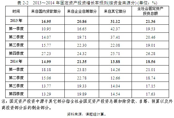 此外,2013年按現(xiàn)價(jià)計(jì)算的全社會(huì)固定資產(chǎn)投資總額增速可能達(dá)到21.36%,比上年提高2.04個(gè)百分點(diǎn);2014年可能回落至18.56%的水平。其中,按資金來(lái)源分類(lèi)看,2013年來(lái)源于國(guó)內(nèi)信貸的投資增速可能比2012年增加6.93個(gè)百分點(diǎn),達(dá)到16.95%;來(lái)源于企業(yè)自籌的投資增速將為20.86%,比上年下降1.34個(gè)百分點(diǎn);其他資金來(lái)源的投資增速為31.12%,比上年提高17.05個(gè)百分點(diǎn)。到2014年,來(lái)源于國(guó)內(nèi)貸款部分的投資增速將下將至14.99%;企業(yè)自籌部分的投資增速則小幅上升至21.35%;而其他部分的投資增速可能下降至13.88%(表2-2)。