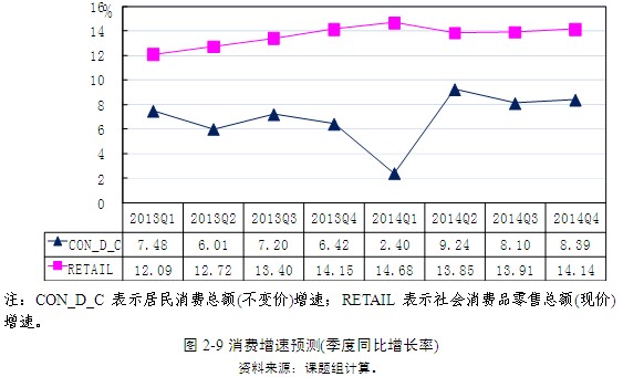 分季度看,居民消費(fèi)總額(不變價(jià))增速將呈現(xiàn)震蕩調(diào)整的趨勢(shì)。2013年第三季度的增速將達(dá)到7.20%,至第四季度將回落到6.42%。2014年第一季度該指標(biāo)可能跌至2.40%,而第二季度將大幅回升至9.24%,剩余兩個(gè)季度則可能維持在8.20%左右。社會(huì)消費(fèi)品零售總額(現(xiàn)價(jià))在2013年第三季度增速將為13.40%,此后持續(xù)上升到第四季度的14.15%。2014年第一季度繼續(xù)上升至14.68%后將有所回落,第四季度可能達(dá)到14.14%(圖2-9)。