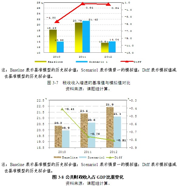 第四,盡管企業(yè)自籌資金投資增速的提高帶動(dòng)了GDP的增長(zhǎng),進(jìn)而帶動(dòng)稅收收入提高,但是,公共財(cái)政收入的增速變化則有所差異。2010-2012年期間,稅收收入增速較基準(zhǔn)模型的歷史擬合值分別變化了-4.63、0.64和0.54個(gè)百分點(diǎn),呈現(xiàn)出先下降后上升的趨勢(shì);公共財(cái)政收入增速分別較基準(zhǔn)模型的歷史擬合值下降了2.33、1.97和0.26個(gè)百分點(diǎn)(圖3-7)。公共財(cái)政收入占GDP的比重變?yōu)?9.9%、20.6%、21.1%,分別比基準(zhǔn)模型的歷史擬合值下降了0.41、0.76、0.81個(gè)百分點(diǎn)(圖3-8)。