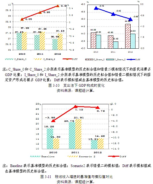 第三,得益于居民消費需求的擴大以及經(jīng)濟增長的加快,企業(yè)自籌投資增速相較基準(zhǔn)模擬水平也有所提高。同時,稅收收入增速也逐漸加快。與基準(zhǔn)模型的歷史擬合值相比,在2010-2012年期間,稅收收入增速先降低3.98百分點,之后提高1.12、0.78個百分點(圖3-11)。財政總收入占GDP的比重分別下降0.4、0.78和0.89個百分點(圖3-12)。