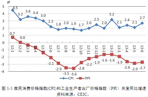 至2013年6月(圖1-5),消費者價格指數(CPI)同比上漲2.7%,其中翹尾因素貢獻70.4%,當年價格上漲因素貢獻29.6%。扣除食品和能源的CPI上漲1.7%,非食品CPI上漲1.6%。結合環(huán)比數據,上半年CPI的變化較為平緩。另一方面,工業(yè)生產者出廠價格指數(PPI)持續(xù)下降。至6月,PPI同比下跌2.7%,而且下跌的幅度不斷擴大。PPI下降可能源自于大宗商品價格的下跌;⑴同時也是現階段中國鋼鐵、煤炭、玻璃、鋁、光伏、水泥等行業(yè)(結構性)產能過剩的體現。