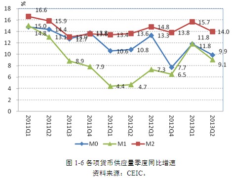 2013年上半年貨幣政策基本維持穩(wěn)健趨緊的態(tài)勢,貨幣信貸增速平穩(wěn)下滑。第一季度廣義貨幣供應量(M2)同比增長15.7%,第二季度增長14%,分別比上年同期下降了2.46和4.47個百分點。至6月末,流通中現金(M0)增長9.7%,比上年同期下降1.1個百分點。上半年人民幣貸款余額同比增長14.2%,比上年同期下降1.8個百分點;新增貸款5.1萬億元,同比多2218億元。其中,新增貸款中房地產行業(yè)所占比重大幅度增長,約占25.6%,比上年同期提高了近14個百分點。與此同時,上半年社會融資總量快速增長,至6月同比增速達到30.5%。人民幣新增貸款占社會融資總量的比重為50%,比上年同期下降19.9個百分點。