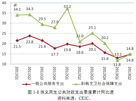 綜上,2013年上半年外部市場需求低迷加上國內產能過剩,導致工業(yè)生產增長乏力,經濟增速持續(xù)下降,公共財政收入增速大幅下滑。盡管價格水平保持平穩(wěn),但是,城鄉(xiāng)居民實際收入增速的減緩,從根本上抑制了居民消費需求的擴張。國有企業(yè)投資、國內貸款投資以及交通運輸領域投資增速的大幅度提高,一定程度上抵消了私人部門制造業(yè)投資增速的下滑,使固定資產投資增速得以保持穩(wěn)定增長。投資依然是經濟增長的主要動力,中國經濟結構失衡的局面也在繼續(xù)。下半年,雖然世界經濟的恢復性增長將有利于緩解中國出口增長持續(xù)下降的壓力,使中國經濟2013年有望實現中央年初制定的7.5%的增長目標。但是,經濟結構失衡的局面不僅沒有改善的跡象,相反,卻有進一步加劇的趨勢,尤其是在公共財政收入增速下降的背景下,公共財政支出中用于民生的支出增速比政府的一般公共服務支出增速更為急劇地下降,抑制了公共財政支出向民生領域的傾斜,城鄉(xiāng)居民實際收入增速的下滑,都將阻礙中國經濟轉變經濟發(fā)展方式、調整經濟結構失衡,居民收入與經濟的同步增長。