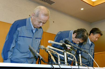 26日,東京電力公司總裁広瀬奈央美(左)在奈良縣福島復(fù)興總部的新聞發(fā)布會(huì)上為核污水泄漏事件鞠躬謝罪。東京電力公司表示,將邀請(qǐng)外國(guó)專(zhuān)家協(xié)助處理泄漏的高輻射核污水。日本有關(guān)方面稱(chēng),可能需要投入36億美元用于核污水清理。