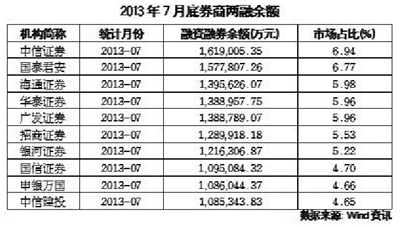 WIND統(tǒng)計數(shù)據(jù)顯示,截至今年7月末,從兩融余額來看,市場份額占據(jù)前十的分別為中信證券、國泰君安、海通證券、華泰證券、廣發(fā)證券、招商證券、銀河證券、國信證券、申銀萬國和中信建投。盡管同為上市券商,東吳證券、國海證券等區(qū)域性券商的市場份額均在1%以下。一位券商業(yè)人士對記者表示,目前證券公司的創(chuàng)新業(yè)務(wù)包括兩融、約定回購等都對資本金消耗量較大,券商核心指標(biāo)凈資本的規(guī)模一定程度上決定了券商創(chuàng)新業(yè)務(wù)開展的空間。這也是大券商在這些業(yè)務(wù)上占據(jù)優(yōu)勢的主要原因。如果不能實(shí)現(xiàn)差異化競爭,一些區(qū)域性的中小券商恐怕難逃被兼并的下場!114家券商,減一半還嫌多!彼f。
