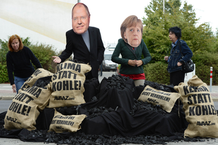 9月1日,在德國柏林大選電視辯論場外,抗議者戴著德國總理默克爾與反對黨社民黨總理候選人施泰因布呂克的面具。默克爾與施泰因布呂克主要圍繞最低工資制、稅收政策、幼兒看護(hù)政策、養(yǎng)老和醫(yī)療保險(xiǎn)、能源轉(zhuǎn)型、希臘債務(wù)以及敘利亞局勢等話題展開。特別是德國一再對南歐小國希臘的援助,讓德國人有些不耐煩,反對黨一直指責(zé)政府隱瞞希臘債務(wù)風(fēng)險(xiǎn)的真相。民調(diào)顯示,施泰因布呂克在整場辯論中略占上風(fēng)。