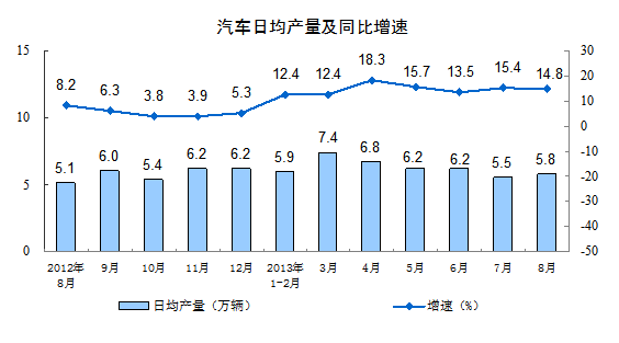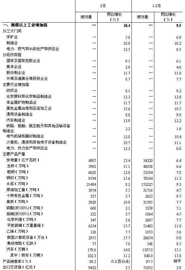 分行業(yè)看,8月份,41個大類行業(yè)中有39個行業(yè)增加值保持同比增長。其中,紡織業(yè)增長8.1%,化學(xué)原料和化學(xué)制品制造業(yè)增長12.3%,非金屬礦物制品業(yè)增長11.7%,黑色金屬冶煉和壓延加工業(yè)增長13.6%,通用設(shè)備制造業(yè)增長8.0%,汽車制造業(yè)增長13.9%,鐵路、船舶、航空航天和其他運輸設(shè)備制造業(yè)增長2.2%,電氣機械和器材制造業(yè)增長12.8%,計算機、通信和其他電子設(shè)備制造業(yè)增長10.7%,電力、熱力的生產(chǎn)和供應(yīng)業(yè)增長12.2%。